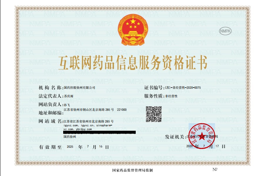 0516-8010-1098 江蘇省徐州市高新技術(shù)開發(fā)區(qū) 北京南路283號(hào)萬泰廣場1號(hào)樓7-13層 互聯(lián)網(wǎng)藥品信息服務(wù)資格證書